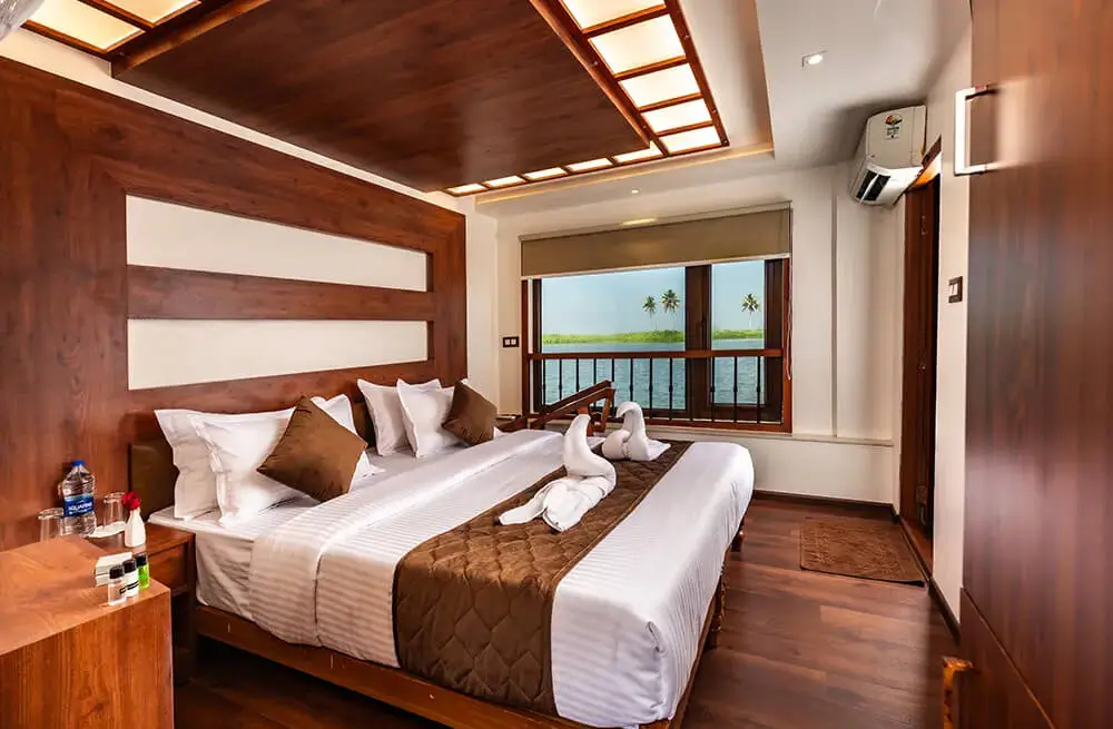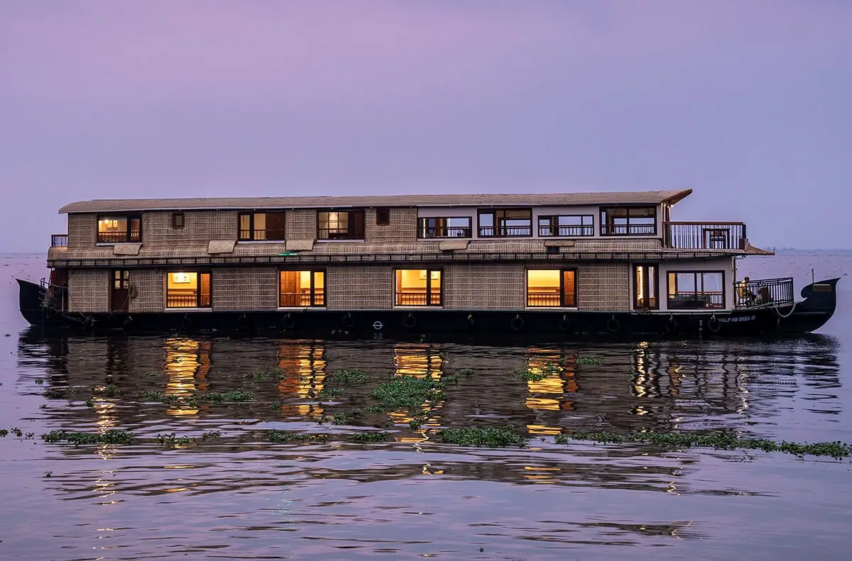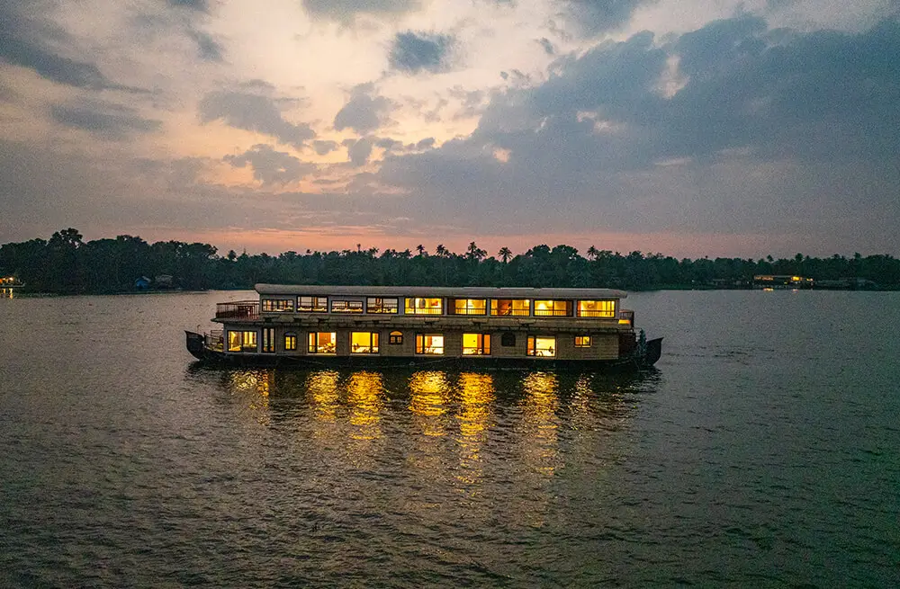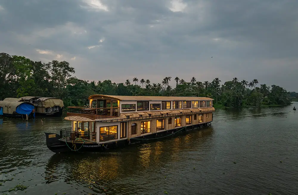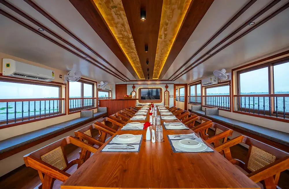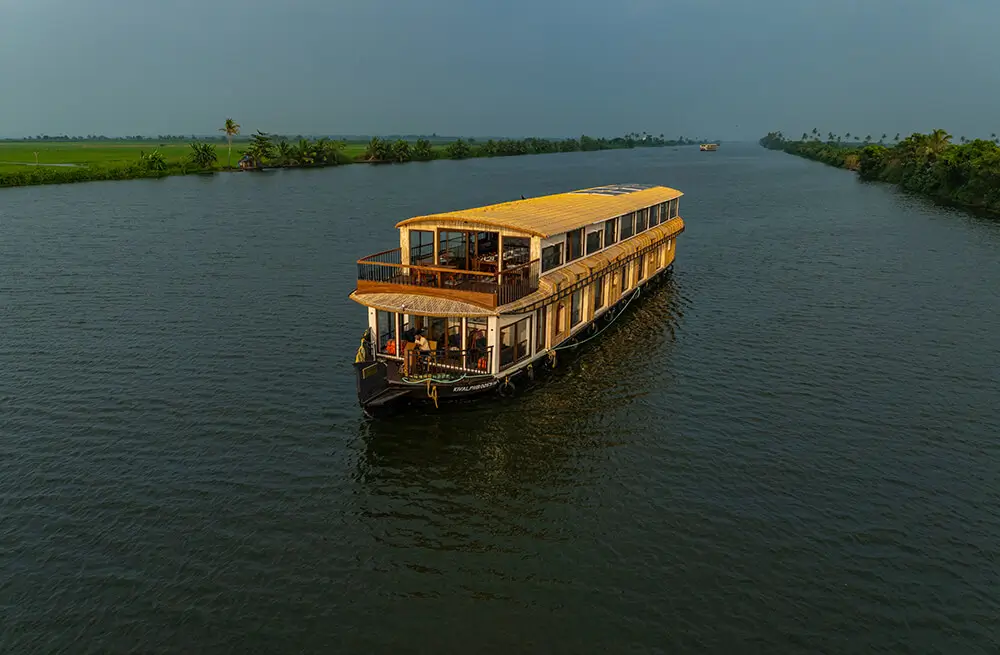 Discover the best luxury houseboat in Alleppey with our 8-bedroom ultra-luxury Kerala houseboat, designed for ultimate comfort and elegance. This luxury boat house in Alleppey features full-time air conditioning, a customized Kerala-style food menu, a spacious upper deck with panoramic Alleppey backwaters views, private bathrooms, a TV in the dining area, and an onboard music system. Perfect for families, corporate groups, and special celebrations, this premium houseboat in Alleppey comfortably hosts up to 24 guests. Cruise through the tranquil Alappuzha backwaters on the luxury Kerala houseboat that blends nature’s charm with five-star amenities. Book your stay today and experience the true essence of Alleppey houseboat luxury.